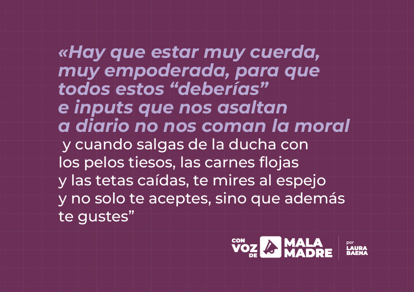 Y señoras, hay que estar muy cuerda, muy empoderada, para que todos estos “deberías” e inputs que nos asaltan a diario no nos coman la moral y cuando salgas de la ducha con los pelos tiesos, las carnes flojas y las tetas caídas, te mires al espejo y no solo te aceptes, sino que además te gustes. Así que claro que sí, caes en la trampa del autocuidado impuesto, de ese autocuidado que no entiende de paz y equilibrio interior, de lecturas que te hacen reflexionar o cafés con personas que te suman. Ese autocuidado que sabe encontrar con su lupa infinita esos “deberías” que necesitan tanto tiempo y tanto dinero, que con el tiempo que te quede y el dinero que te sobre no tendrás ni para pipas.