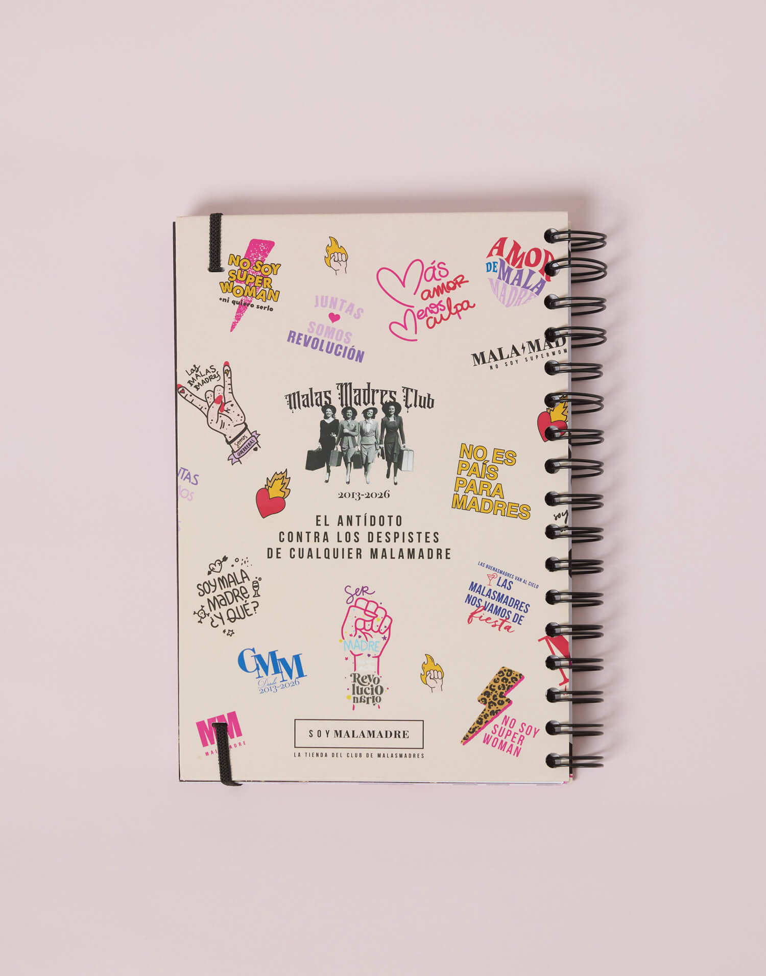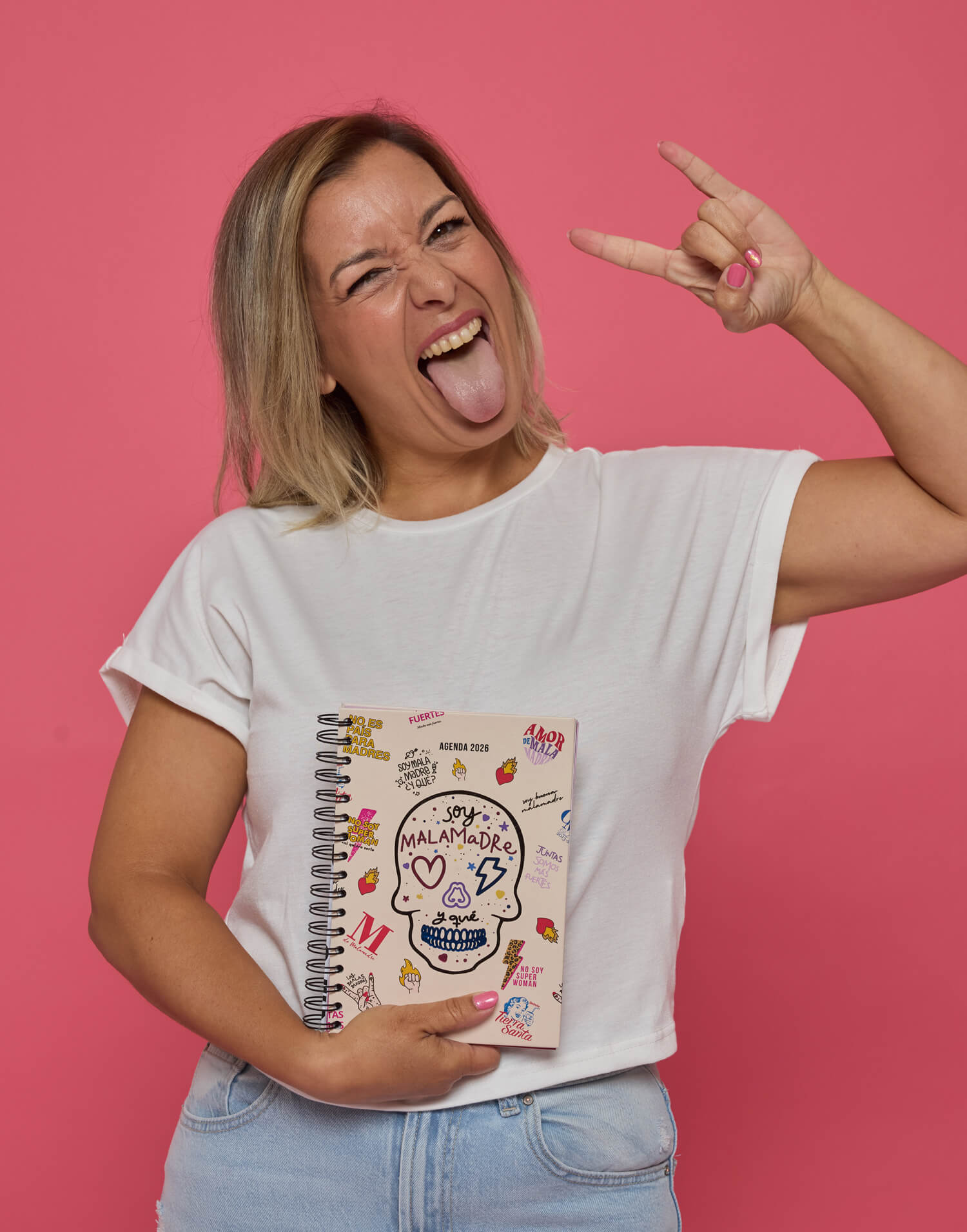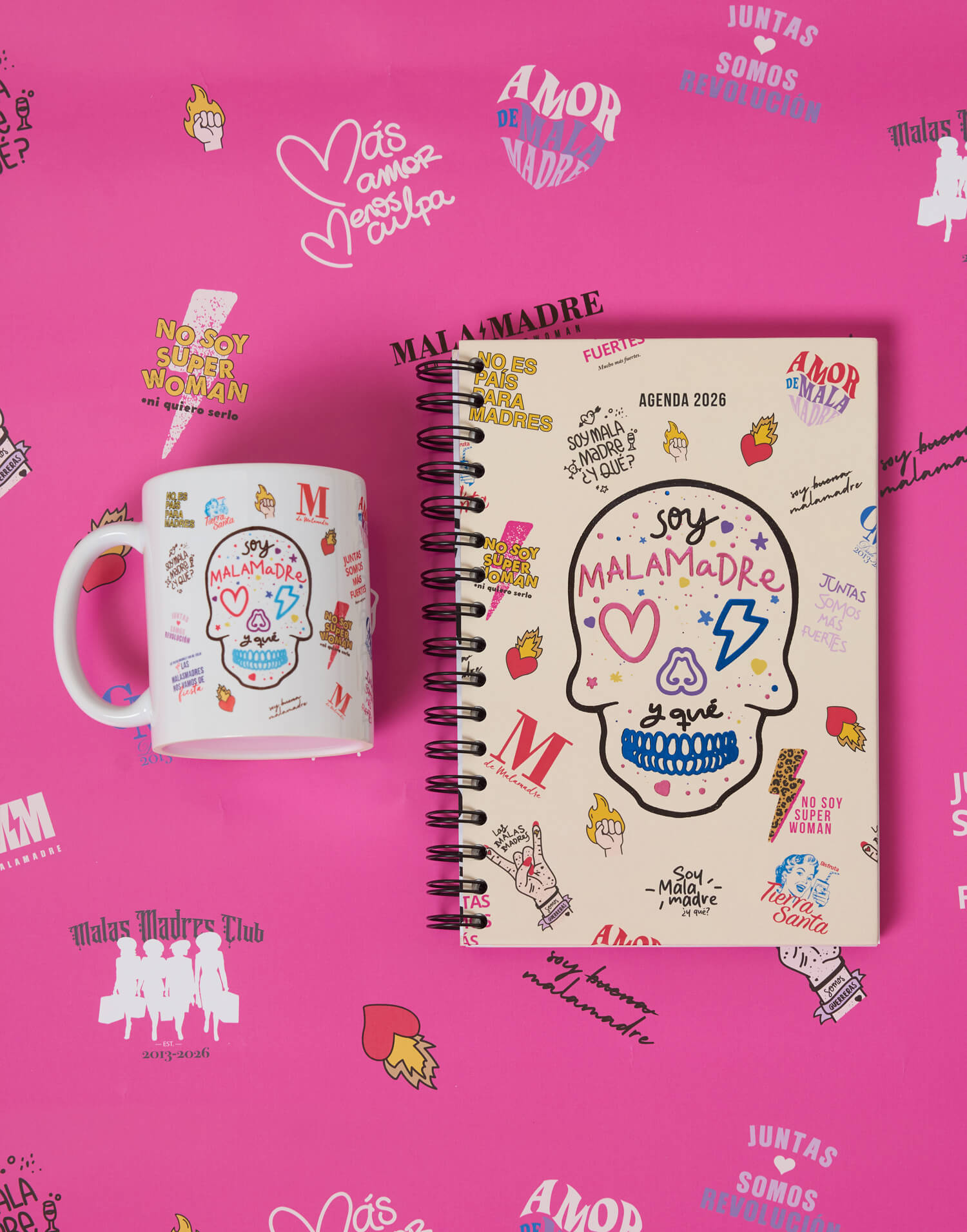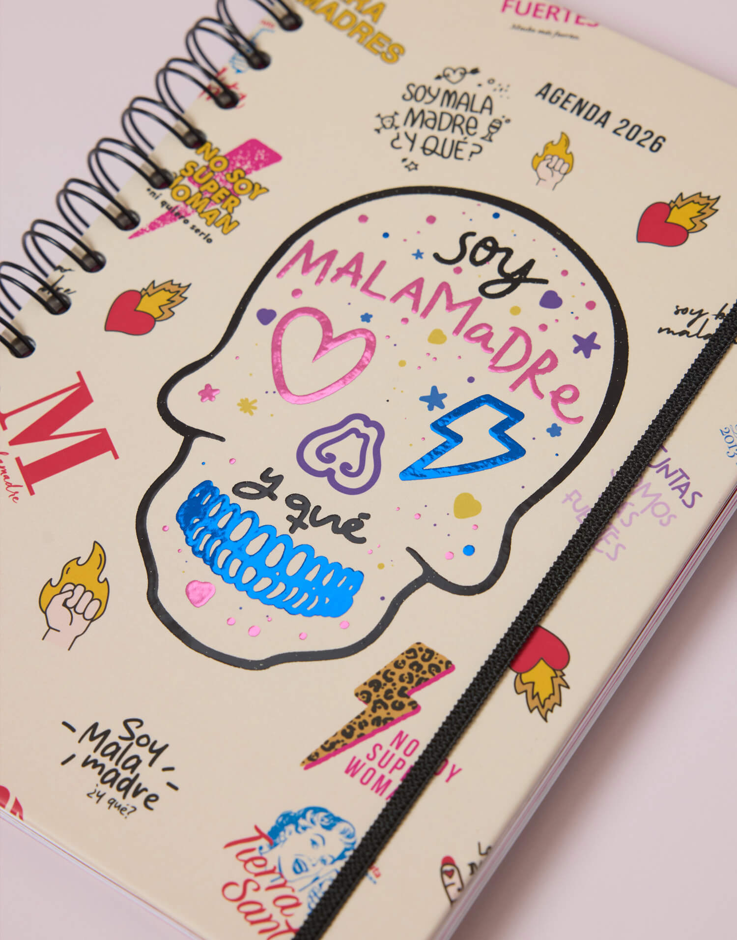 La Agenda 2026 Iconos lleva nuestra calavera que es el grito de Malamadre hecho papel: imperfecta, rebelde y con mucho power. Con frases que inspiran, pegatinas muy nuestras y espacio para organizar el caos diario, te recordará que ser Malamadre es decir “aquí estoy y qué”. Y este año estrenamos interiores a color.